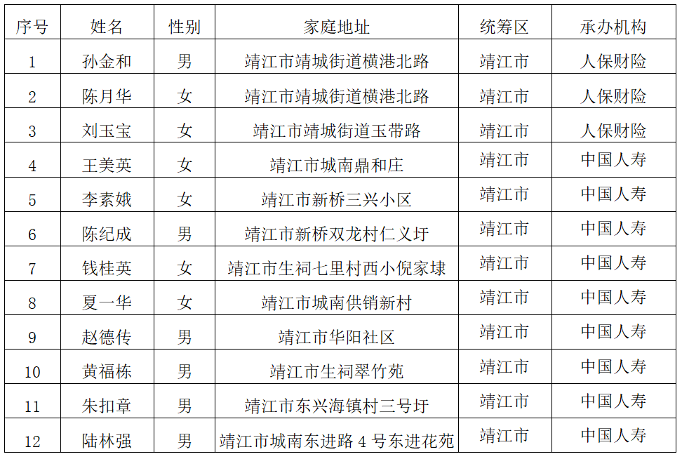 靖江市长期护理保险重度失能人员公示名单
