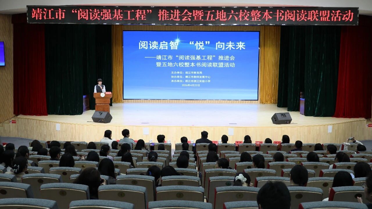 在第31个世界读书日来临之际,4月22日,靖江市“阅读强基工程”推进会暨五地六校整本书阅读联盟活动在靖江市渡江实验小学隆重举行。活动以“阅读启智 ‘悦’向未来”为主题,汇聚五地六校教育界同仁,共探整本书阅读教学新路径。