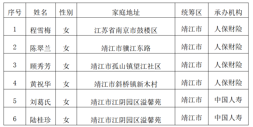 靖江市长期护理保险重度失能人员公示名单
