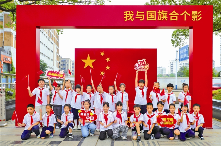 骥江路市民广场上,一群学生与国旗合影。马钰超摄