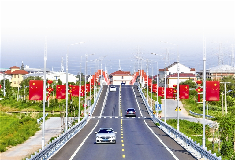 沪陕高速公路季市收费站出入口道路两侧挂满国旗。盛义摄