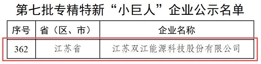 近日,江苏省工业和信息化厅公布了2025年专精特新“小巨人”企业名单,园区企业江苏双江能源科技股份有限公司入选。