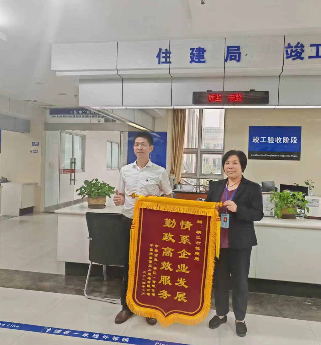 7月11日下午,中粮面业(靖江)有限公司将一面印有“勤政高效服务 情系企业发展”的锦旗,送到市政务服务中心住建窗口和市住建局建管科,感谢工作人员点对点联合服务,助力工程建设项目报建“加速跑”,极大压缩了项目报建的时间和流程。