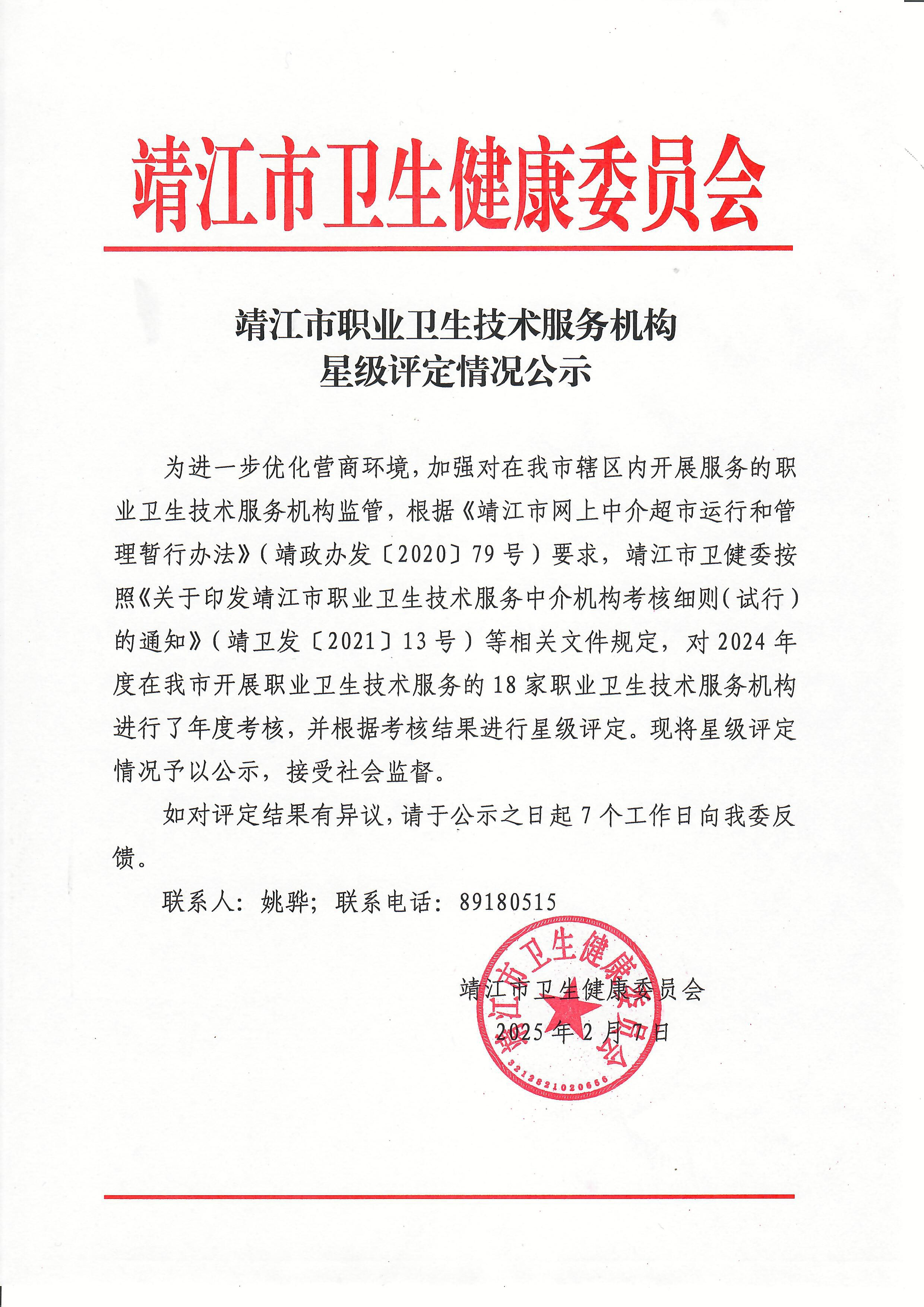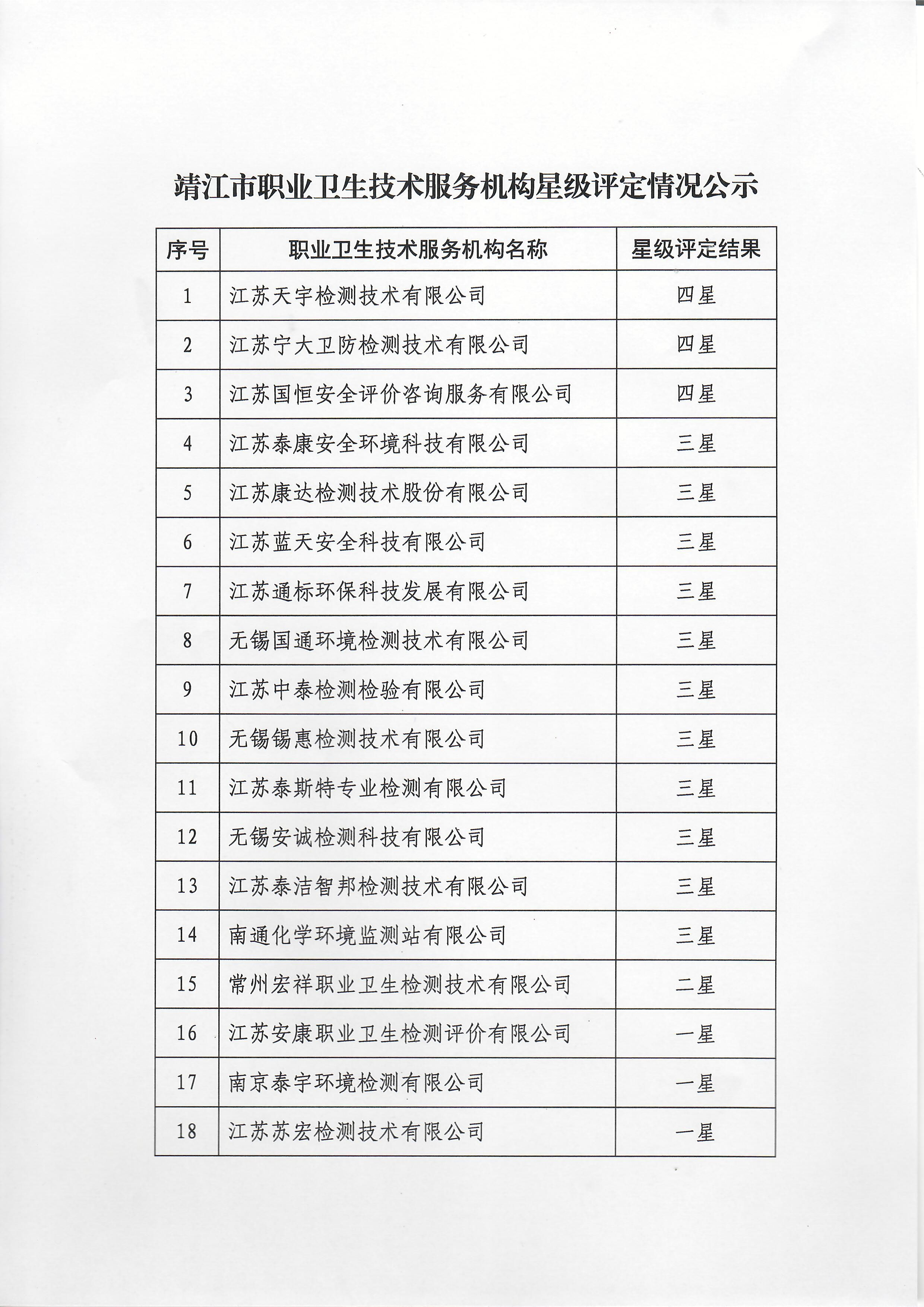 靖江市职业卫生技术服务机构星级评定情况公示